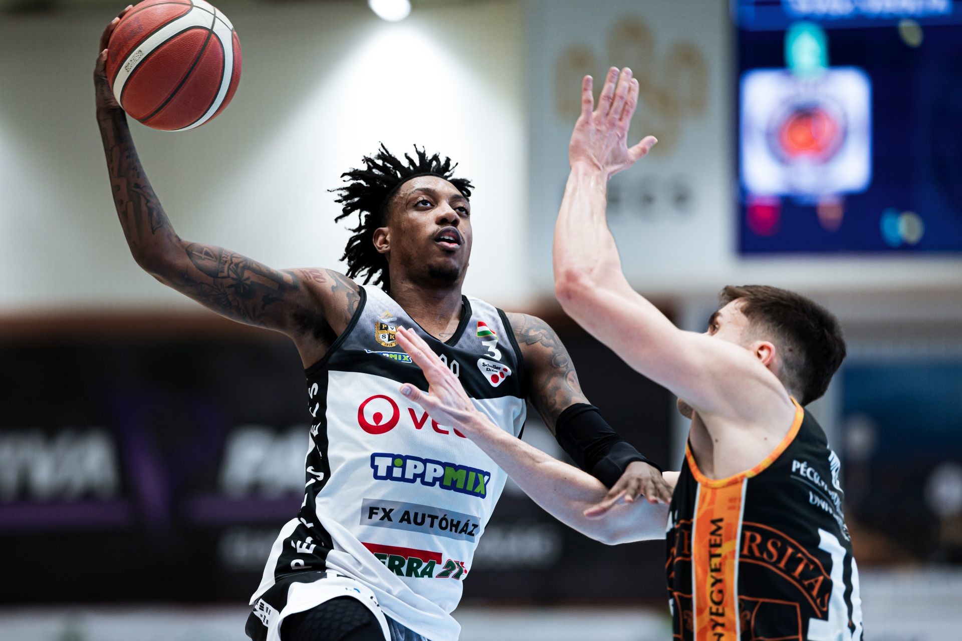 Tíz perc után 20-15-re vezetett ellenfelünk, a második negyedben azonban repülőrajtot vettünk, és 22-20-nál máris nálunk volt az előny. Innentől pedig igazán élvezetessé vált a meccs. Hol az NKA vette vissza a vezetést, hol mi tudtun fordítani. Vaughn az első negyed álmoskás játéka után nagyon beindult és két perc alatt termelt 8 pontot, de Micsovics és Dzseletovics triplái után is izzott a levegő a csarnokban. Centerünk ihletett formában játszott, az első félidőt 19 ponttal zárta, és nagyrészt ennek köszönhetően vezettünk a nagyszünetben 44-43-ra.