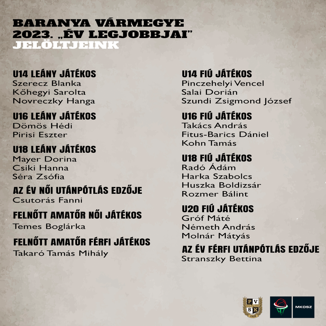A Baranya Vármegyei Kosárlabda Szövetség idén is megrendezi az "Év Legjei" szavazást tizenkét kategóriában. A jelöltek listája megtekinthető az MKOSZ-BMKSZ honlapján, ahol a szavazatokat is le lehet adni 2023. december 31-ig. Az eredményhirdetés és a díjátadó 2024 januárjában lesz. Megkérjük szurkolóinkat, hogy mielőbb adják le szavazataikat egyesületünk jelöltjeire!